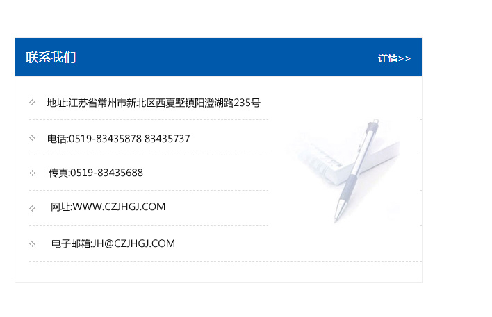 傳真:0519-83435688    郵編:213135    網(wǎng)址:WWW.czjhgj_com.svipyy.com    電子郵箱:JH@czjhgj_com.svipyy.com